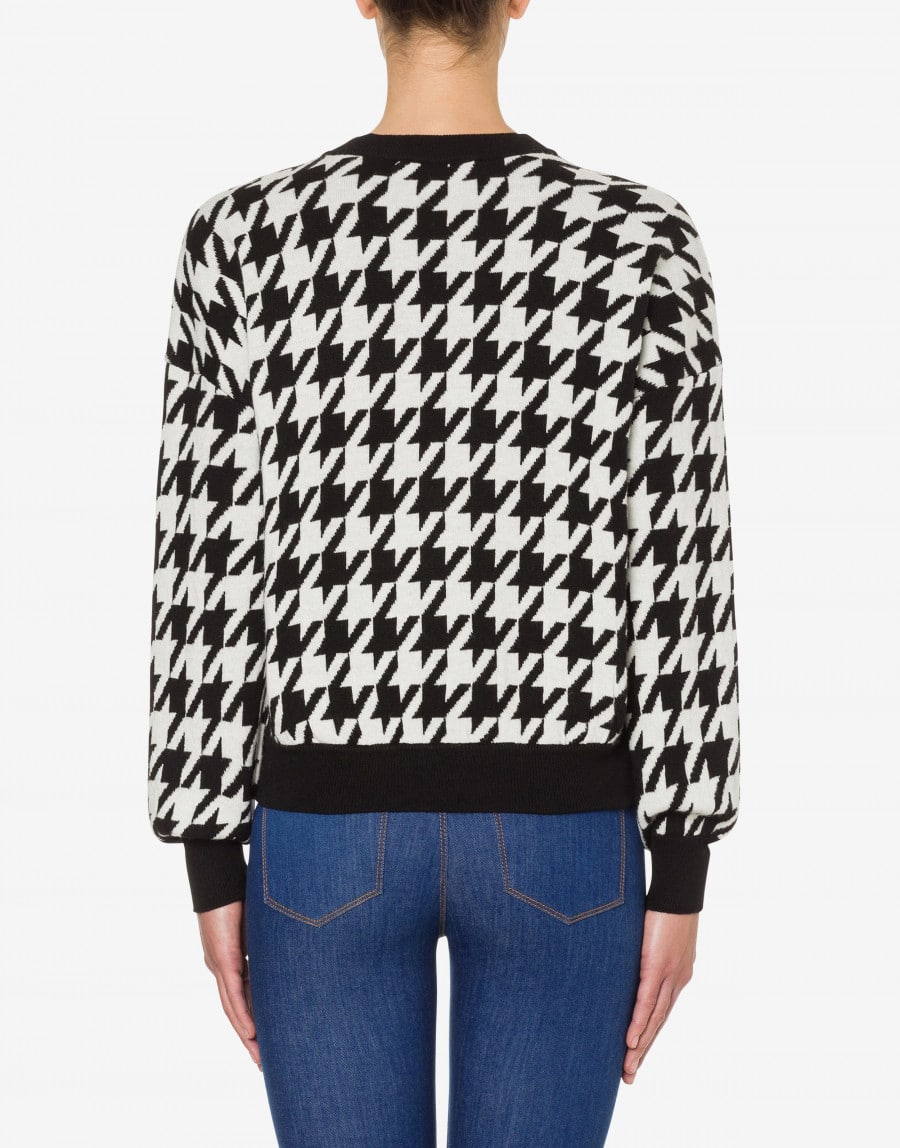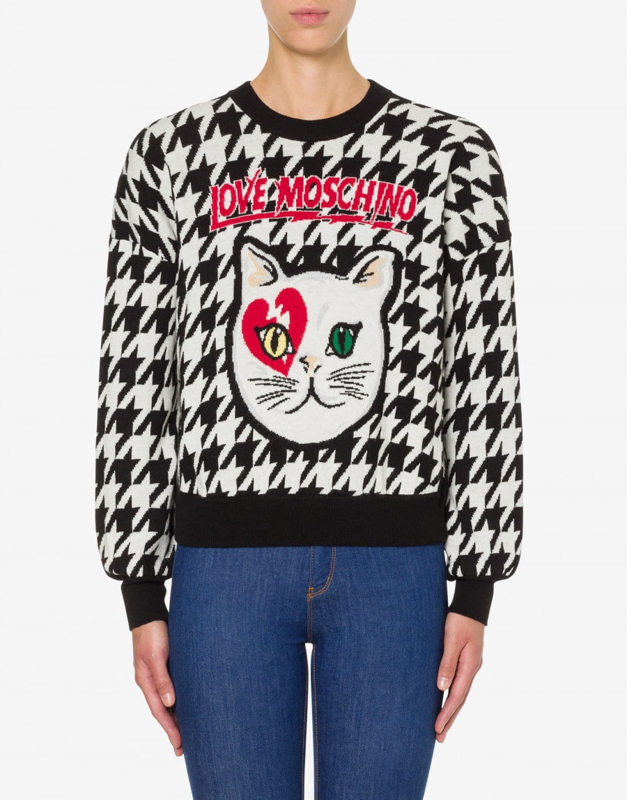 Fashionable women’s Bowie Cat jacquard sweater from Love Moschino featuring a jacquard effect, a houndstooth pattern, ribbed details, a round neck and long sleeves.