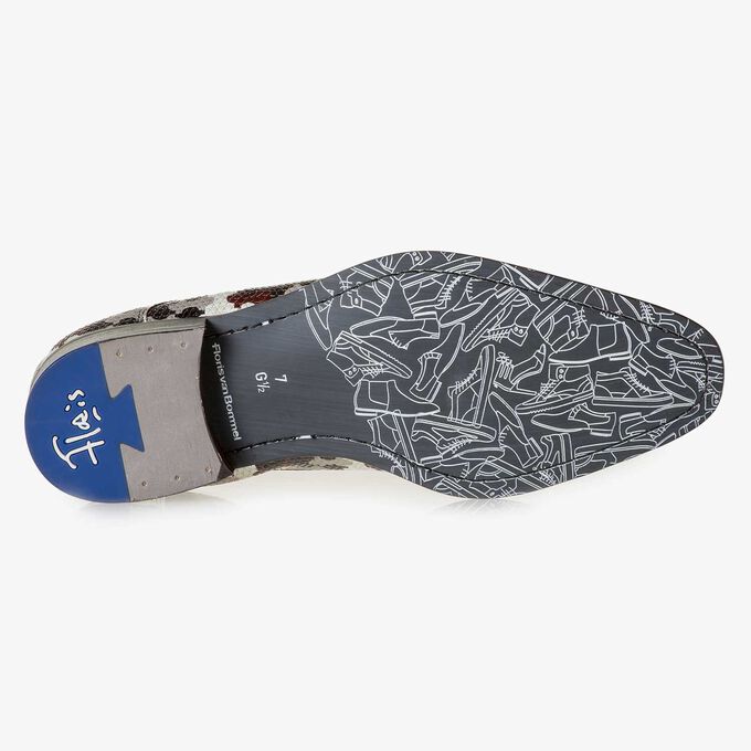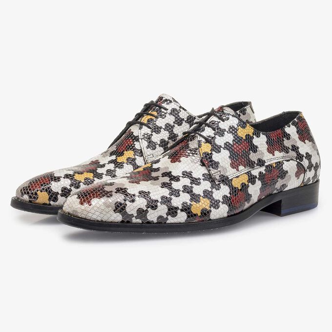 Dieser elegante Derby aus weißem Kalbsleder mit mehrfarbigem Puzzle-Print ist mit einer schwarzen Gummisohle und einem weißen All-Over-Schuhprint versehen.