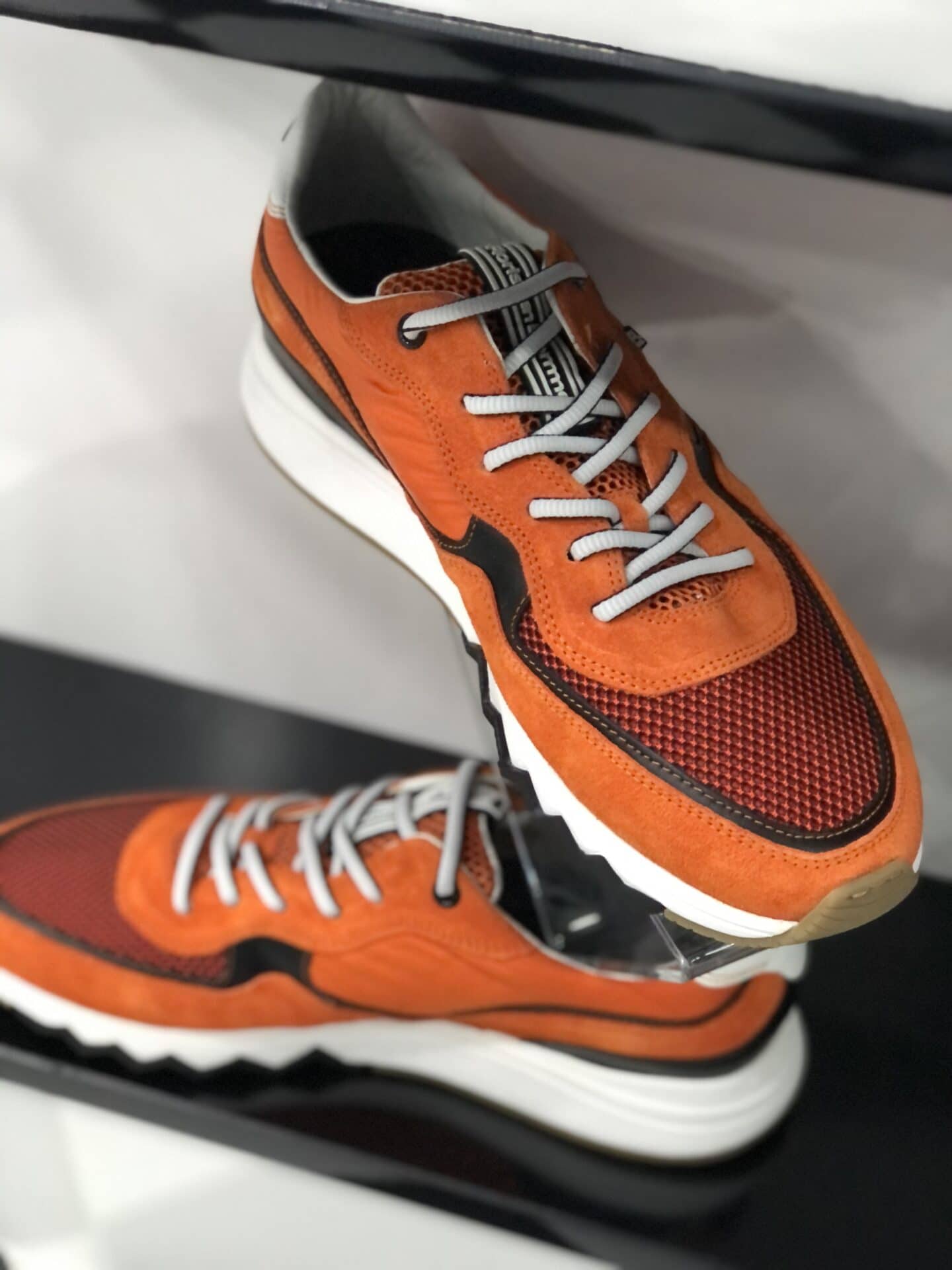 Die Kombination aus verschiedenen Farben und Materialien macht diesen SNEAKER zu einem ganz besonderen Modell. Der Sportliche SNEAKER ist aus orange Leder /Gummiprofilsohle zweifarbig