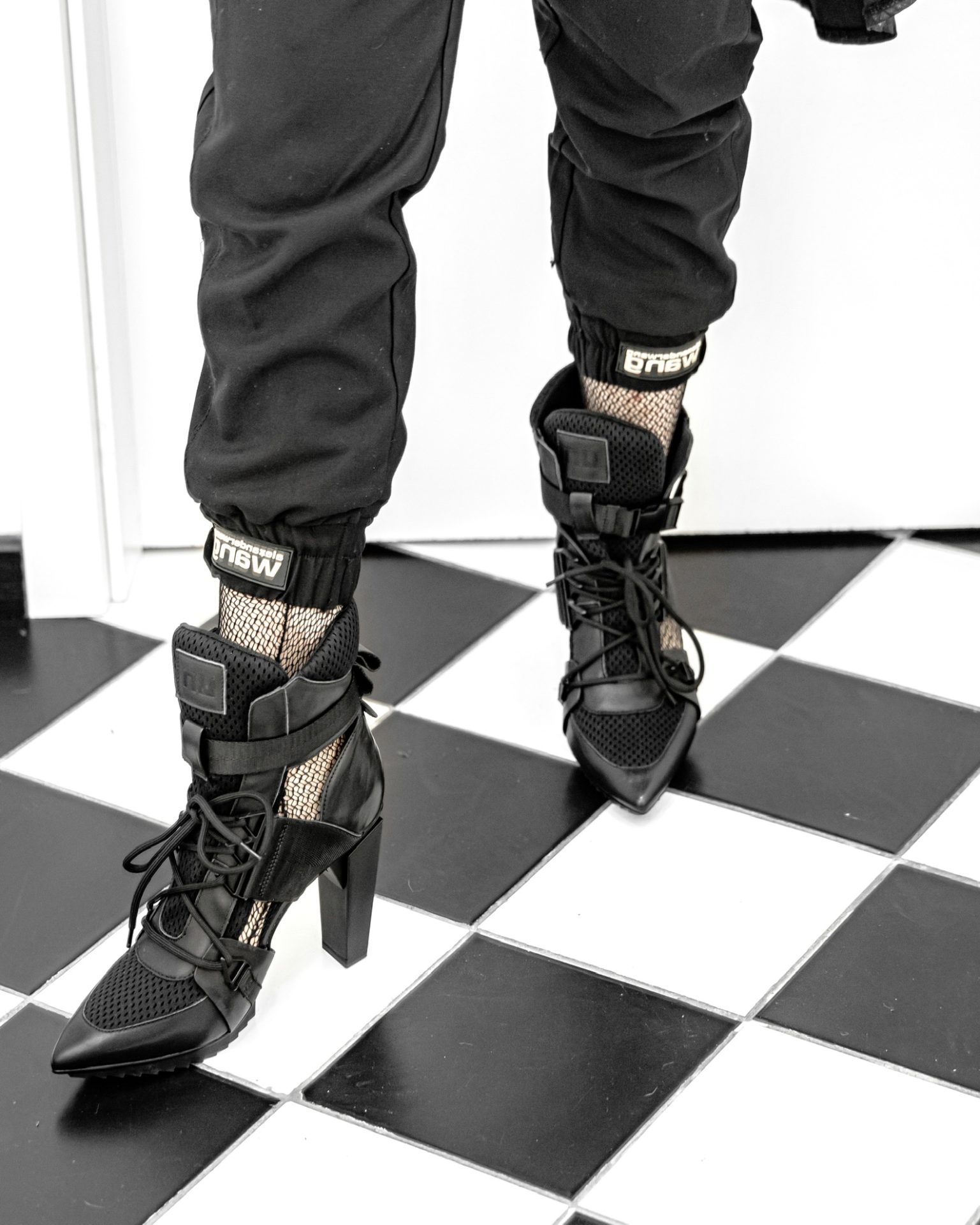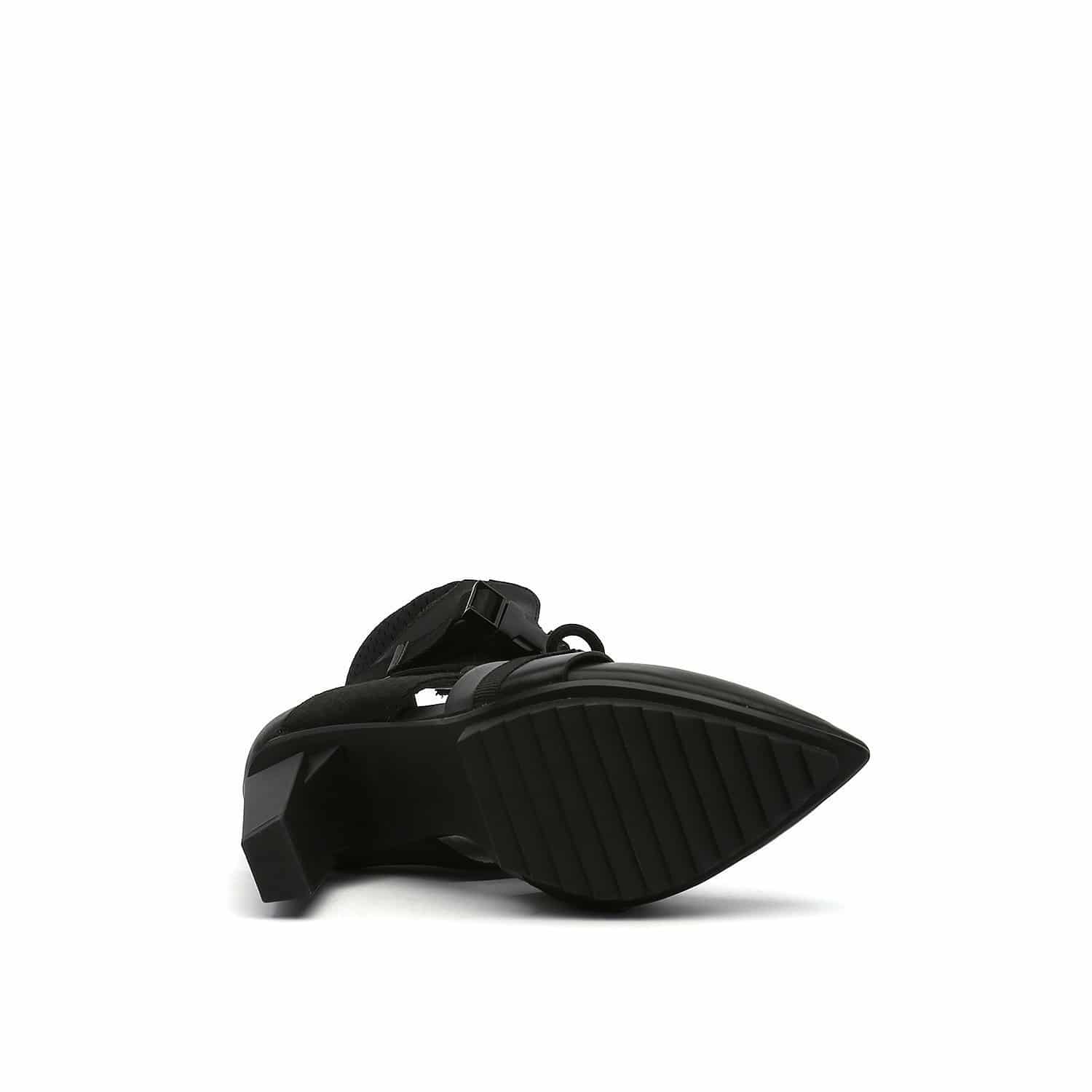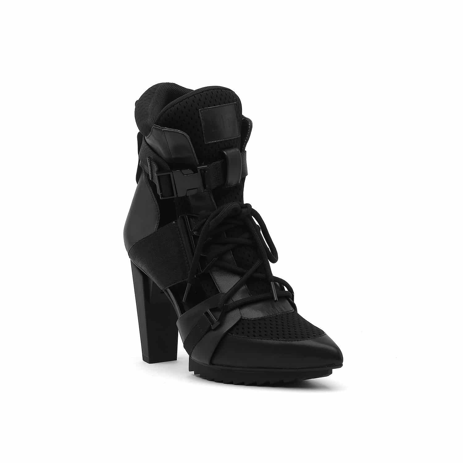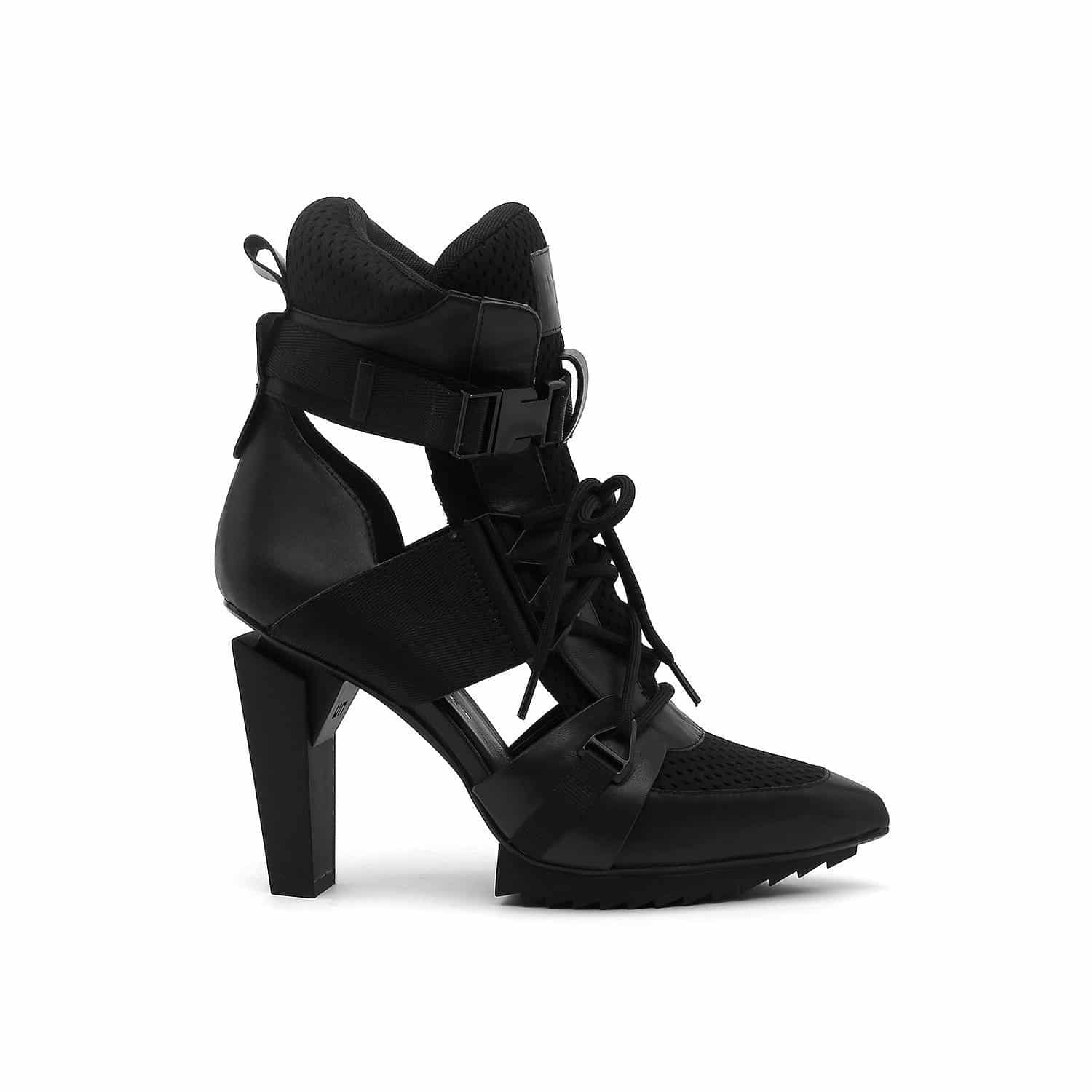 The Lev Sport Boot Hi is a hybrid cutout boot lifted by a slim, angular heel and finished with technical trimming. This fashion forward hybrid combines sporty and formal elements for a style that transcends categories.